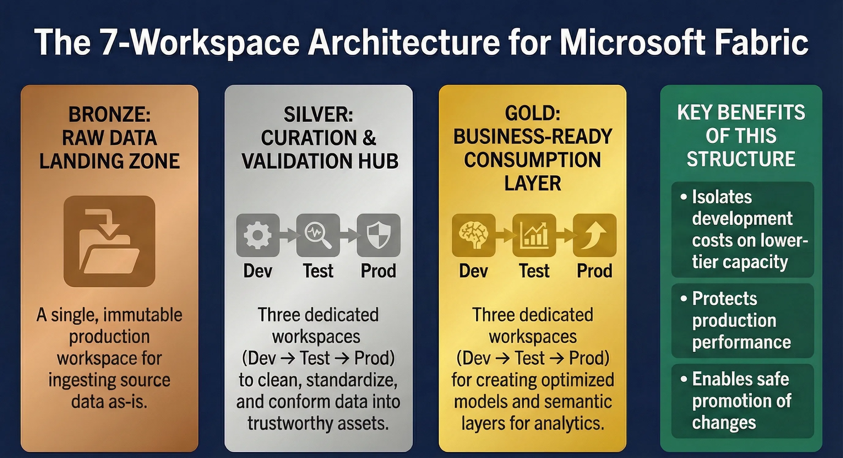 - Gold = consumption workspaces (marts + semantic models + reports)